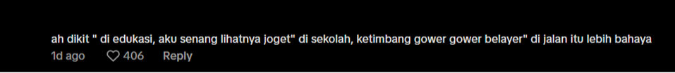 Salah satu komentar warganet menyebutkan, “…aku senang lihatnya joget-joget di sekolah, ketimbang gower-gower belayer–belayer di jalan itu lebih bahaya.”