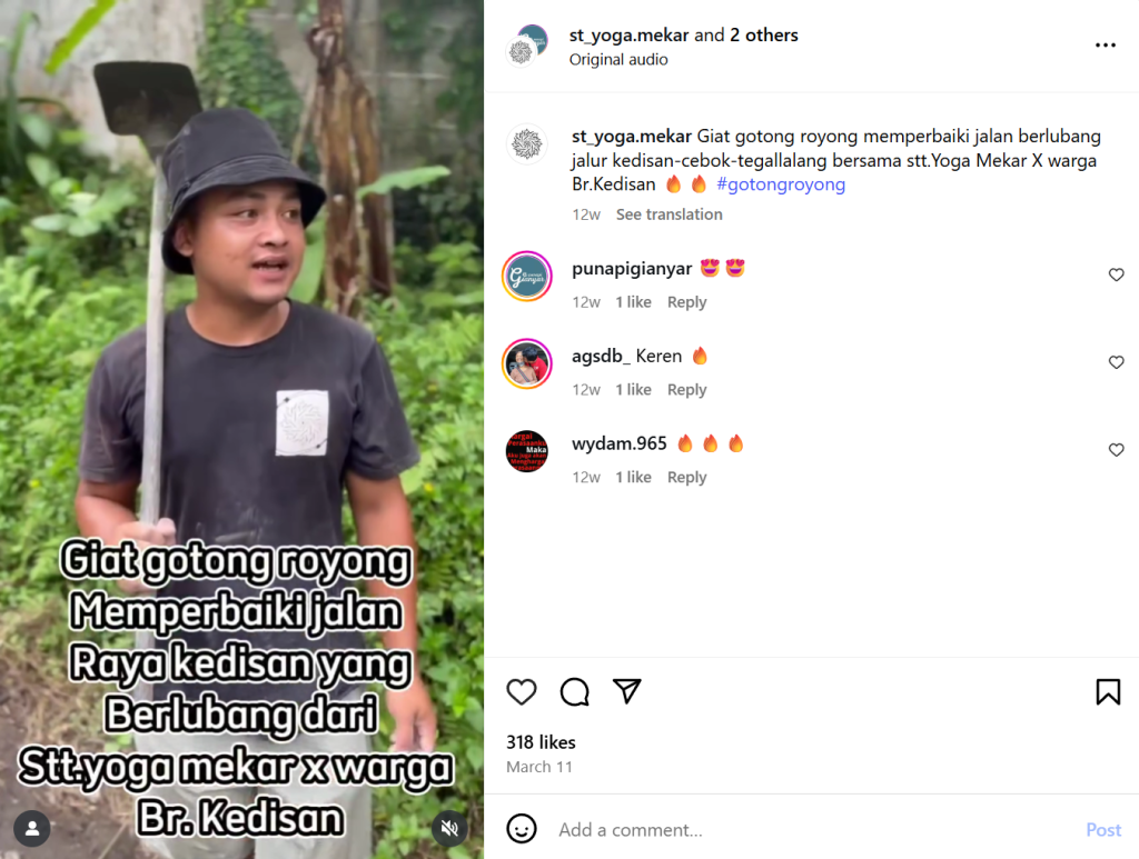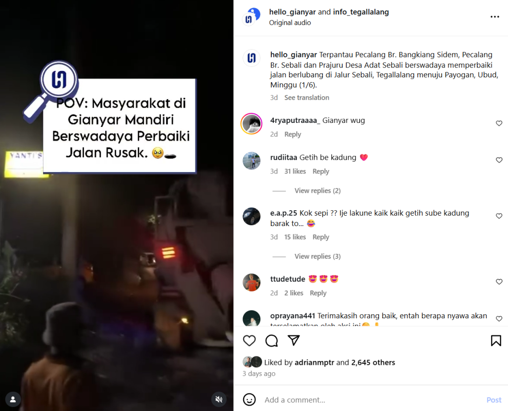 Melansir dari postingan semeton Bali @st_yoga.mekar dan @info_tegallalang terlihat masyarakat bergotong royong dan bahkan berswadaya materi untuk memperbaiki kerusakan jalan raya di wilayah tempat tinggal mereka. Hal ini merupakan suatu kegiatan yang positif dan bentuk kepedulian masyarakat terhadap infrastruktur publik yang mereka gunakan tiap hari. Namun, kemana pemerintah yang seharusnya bertanggung jawab terhadap kerusakan infrastruktur publik? Padahal dana yang dialokasikan untuk perawatan infrastruktur publik sudah ada tiap tahunnya. Mulai dari APBN untuk perawatan jalan nasional hingga dana desa untuk perawatan jalan desa.